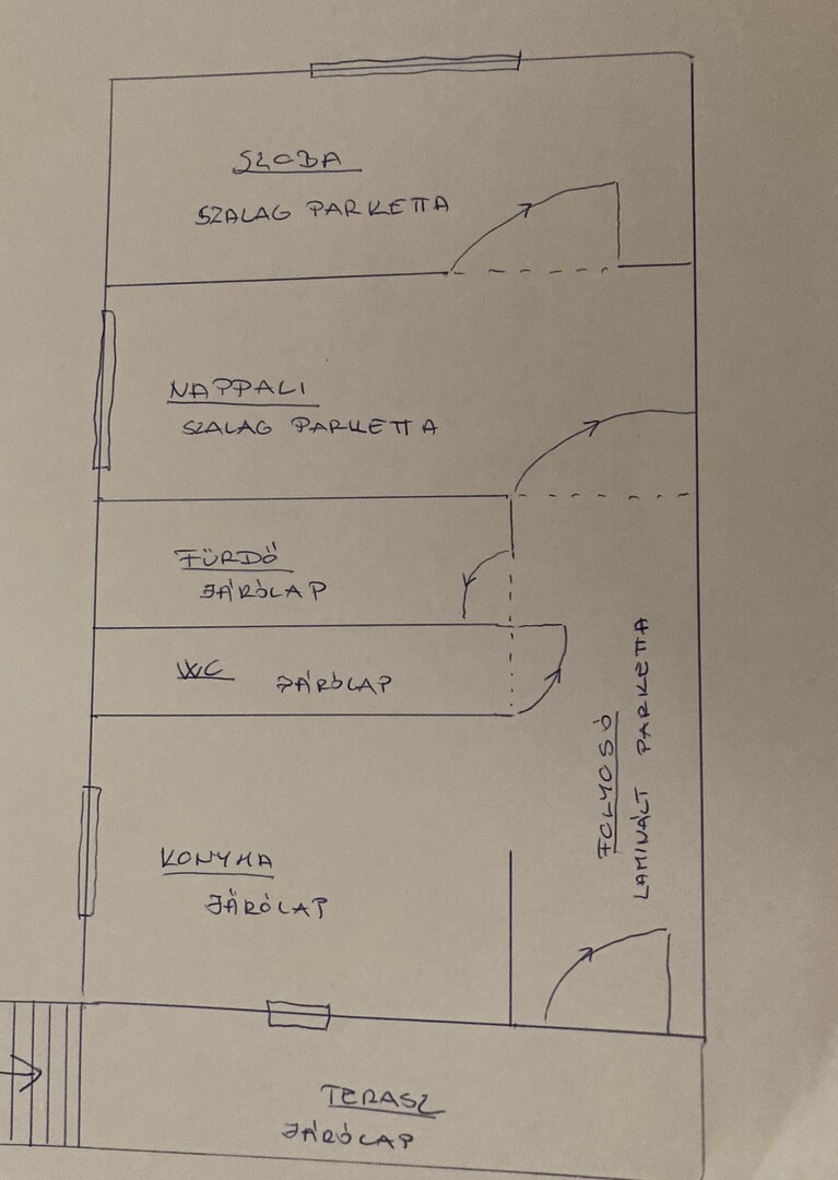 Szobák parkettával a többi helyiségek járólappal, burkoltak.
