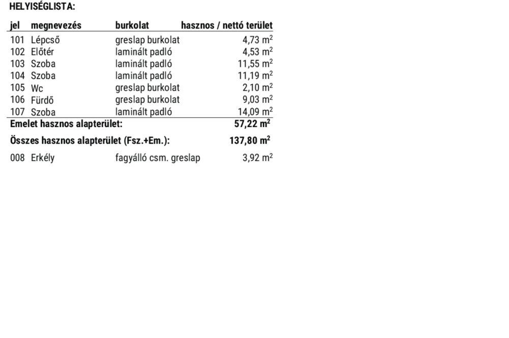 – Emelet: lépcső, előtér, 3 hálószoba, erkély, WC, fürdőszoba