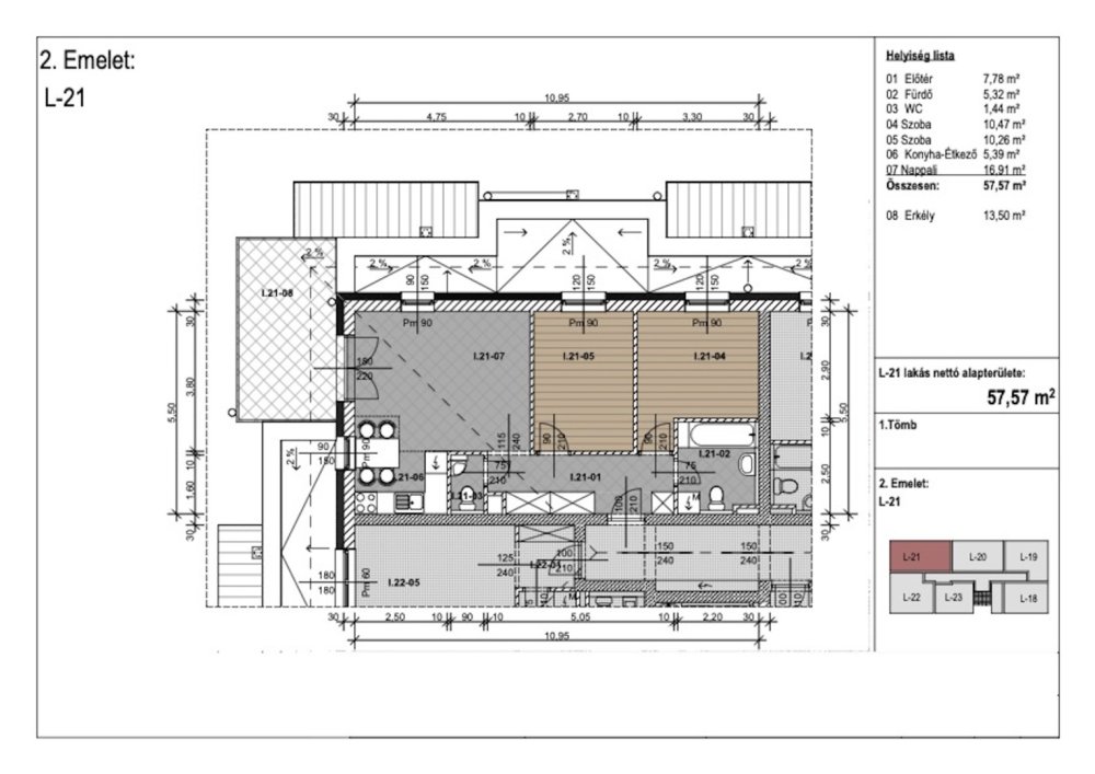 Jelen hirdetésben szereplő második emeleti lakás 57,57 m2 hasznos alapterülettel rendelkezik, elosztását tekintve rendelkezik egy amerikai konyhás nappalival, két hálószobával, egy fürdőszobával, valamint egy 13,5 m2 nagyságú erkéllyel.