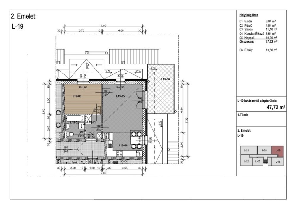 Jelen hirdetésben szereplő második emeleti lakás 47,72 m2 hasznos alapterülettel rendelkezik, elosztását tekintve rendelkezik egy amerikai konyhás nappalival, hálószobával, egy fürdőszobával, valamint egy 13,5 m2 nagyságú terasszal.