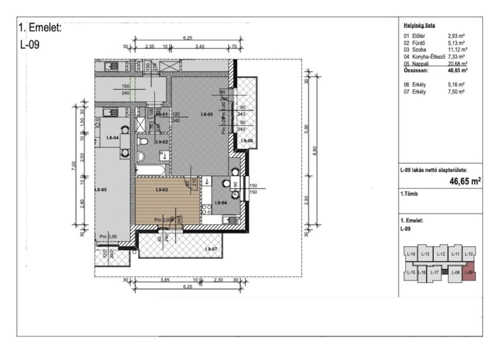 Jelen hirdetésben szereplő első emeleti lakás 47,19 m2 hasznos alapterülettel rendelkezik, elosztását tekintve rendelkezik egy amerikai konyhás nappalival, hálószobával, egy fürdőszobával, valamint egy 5,16 m2 és egy 7,5 m2 nagyságú erkéllyel.
