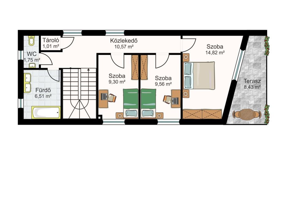 – három különnyíló hálószoba: 9,3, 9,56 és 14,82 m²
