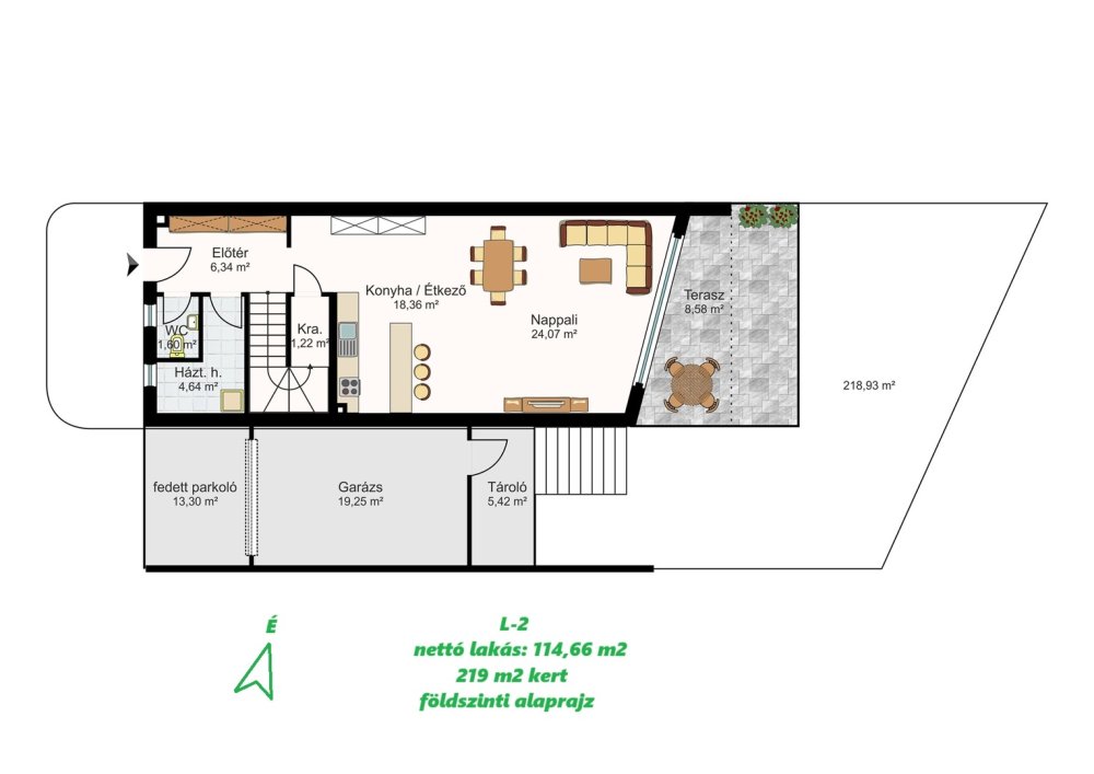 L-2-es; 114,66 m2 nettó lakótér+terasz+erkély, fedett parkoló, garázs, tároló, 219 m2 kert: 129,75 M Ft.-