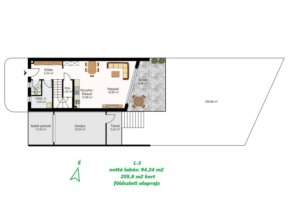 L-3-as; 94,24 m2 nettó lakótér+terasz+erkély, fedett parkoló, garázs, tároló, 259 m2 kert: 105,9 M Ft.-