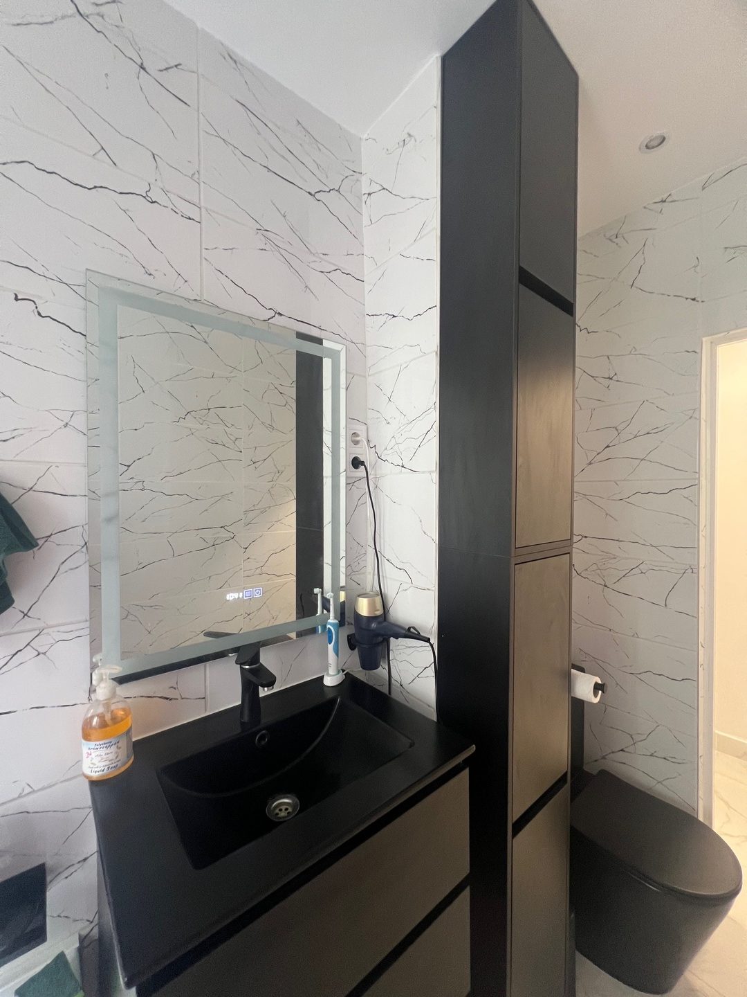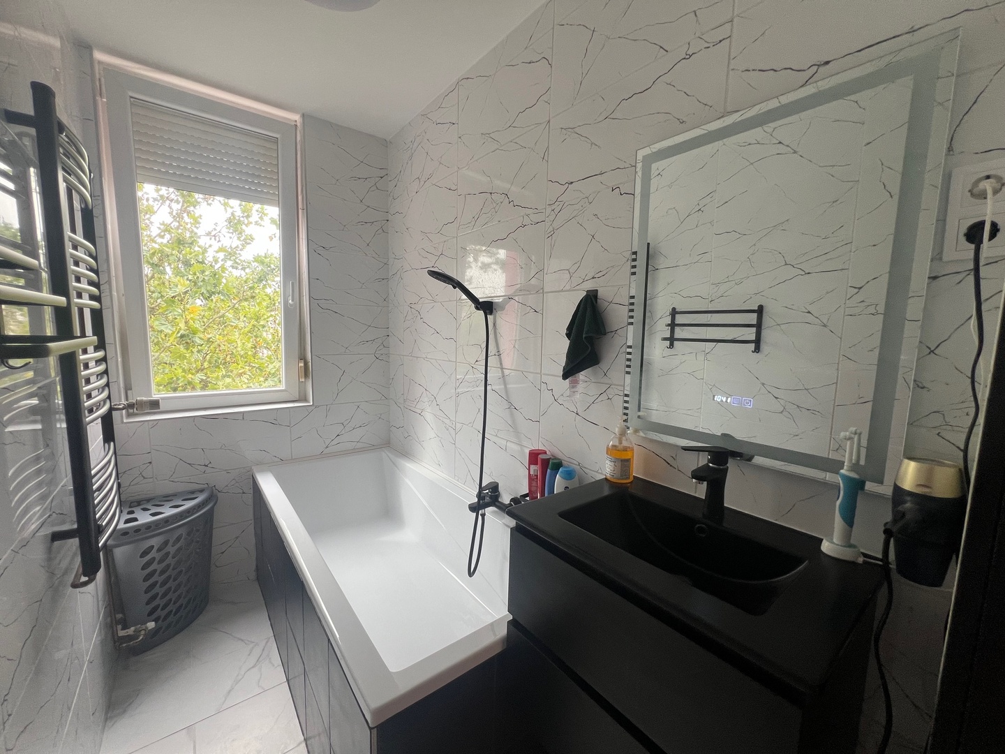 A fürdőszoba bővítésre került minőségi káddal, prémium burkolatokkal, modern olaszfürdőszobabútorral.