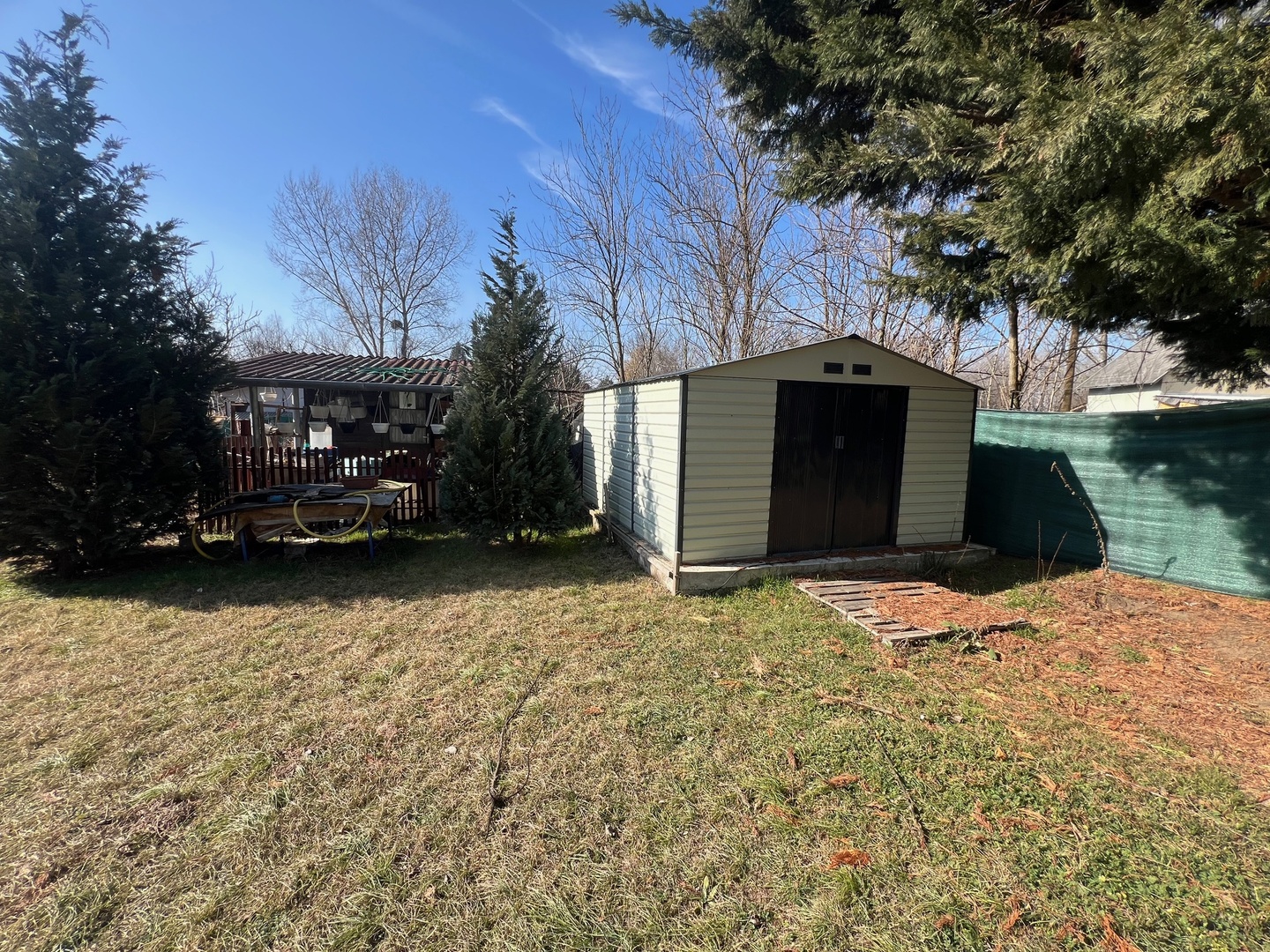 Az ingatlanon egy 15m2 nagyságú faház található 16m2 fedett terasszal, amely villannyal ellátott, és egy 16m2 nagyságú újszerű lemez tároló.