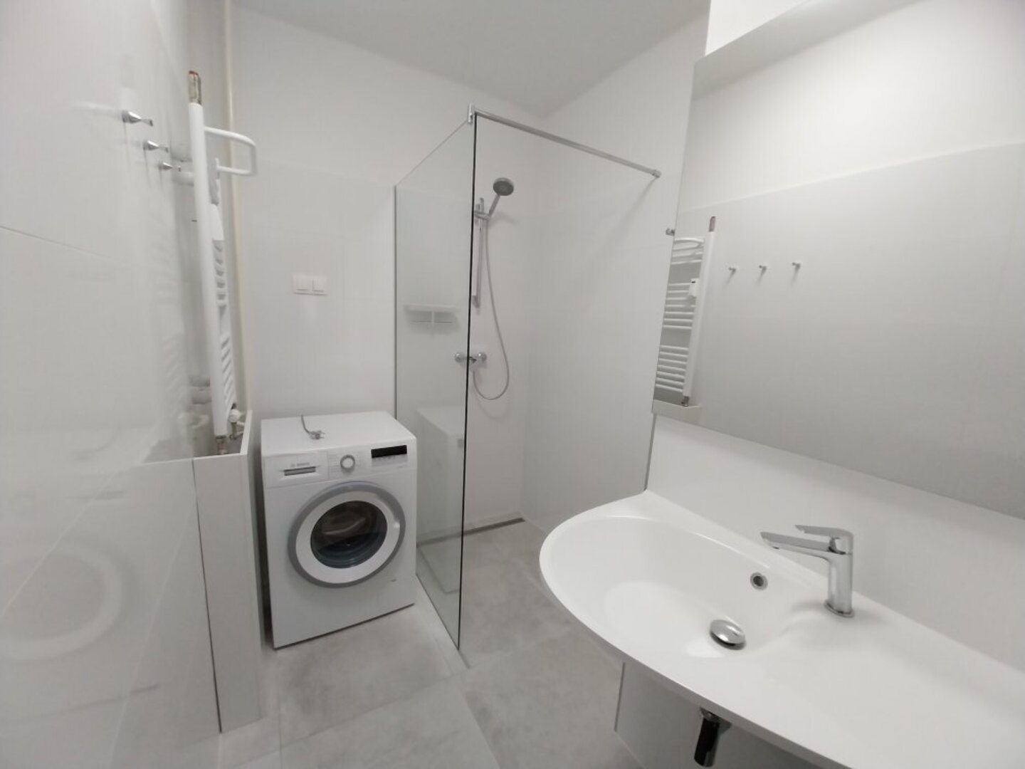 •a fürdőszobában üvegpaneles zuhanyzó, mosógép